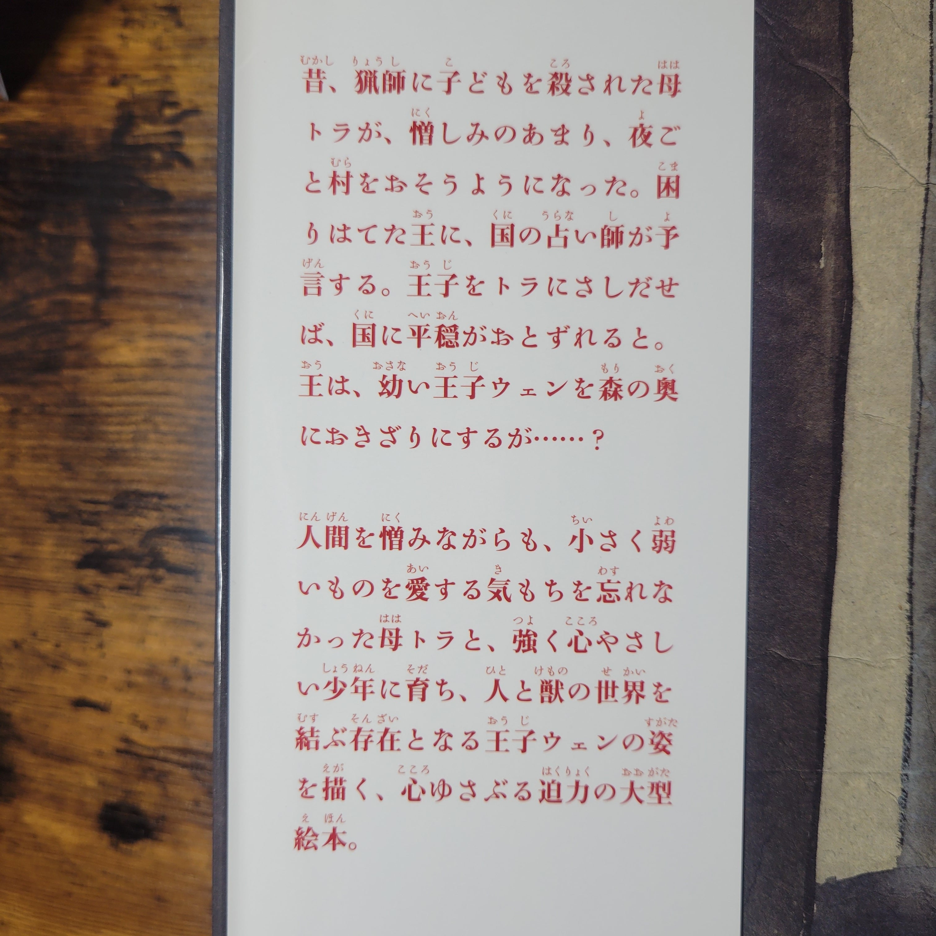 カバー袖より/昔、猟師に子どもを殺された母トラが、憎しみのあまり、夜ごと村をおそうようになった。困りはてた王に、国の占い師が予言する。王子をトラにさしだせば、国に平穏がおとずれると。王は、幼い王子ウェンを森の奥におきざりにするが・・・?人間を憎みながらも、小さく弱いものを愛する気もちを忘れなかった母トラと、強く心やさしい少年に育ち、人と獣の世界を結ぶ存在となる王子ウェンの姿を描く、心ゆさぶる迫力の大型絵本。