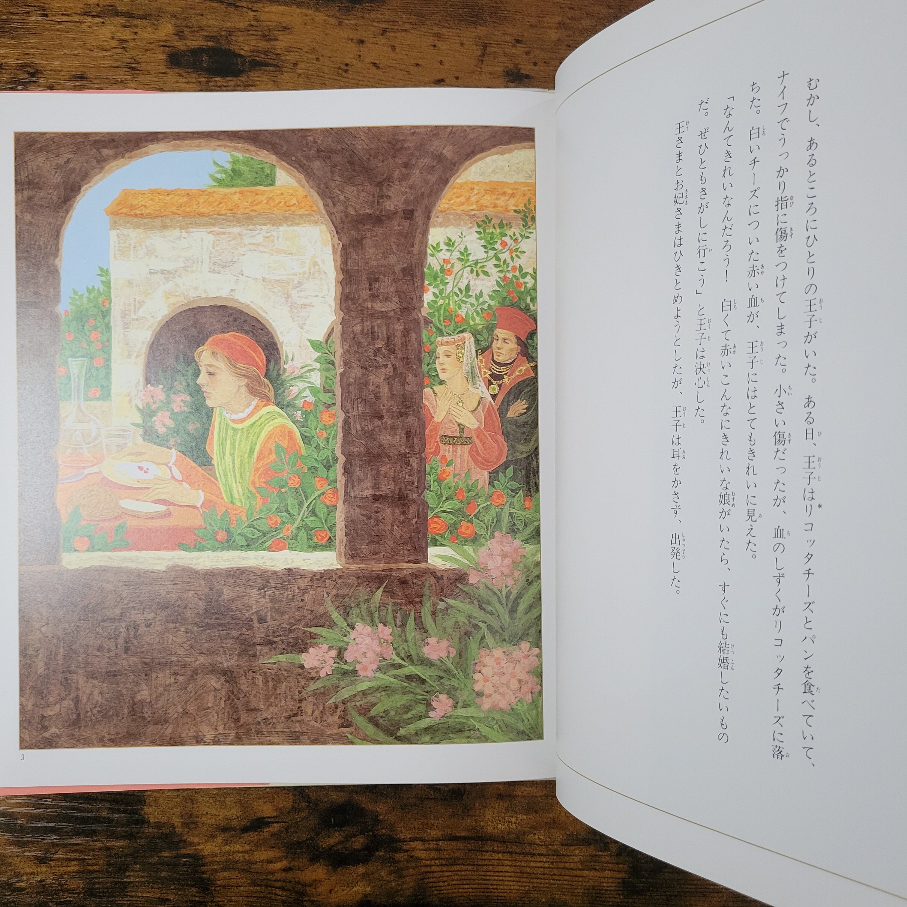カバー袖より/むかし、イタリアのトスカーナ地方に、ひとりの王子がいた。王子はある日、パンとチーズの朝食をとっていて、ナイフで指を傷つけ、赤い血が白いチーズの上にしたたり落ちたのを見て、決心する。「ミルクのように白く血のように赤い、こんな美しい娘と結婚したい!」王子はすぐに斧を一本持って、娘をさがして旅に出る。さいわい王子は、途中、斧で助けた老人の知恵で三つのオレンジを手に入れ、三つめのオレンジの中から現れた美しい娘と望みどおり結婚。その後も魔女と勇敢に戦って打ち勝ち、幸せに暮らすことができたという。──いかにも色彩豊かでつややかなイタリアの代表的昔話。