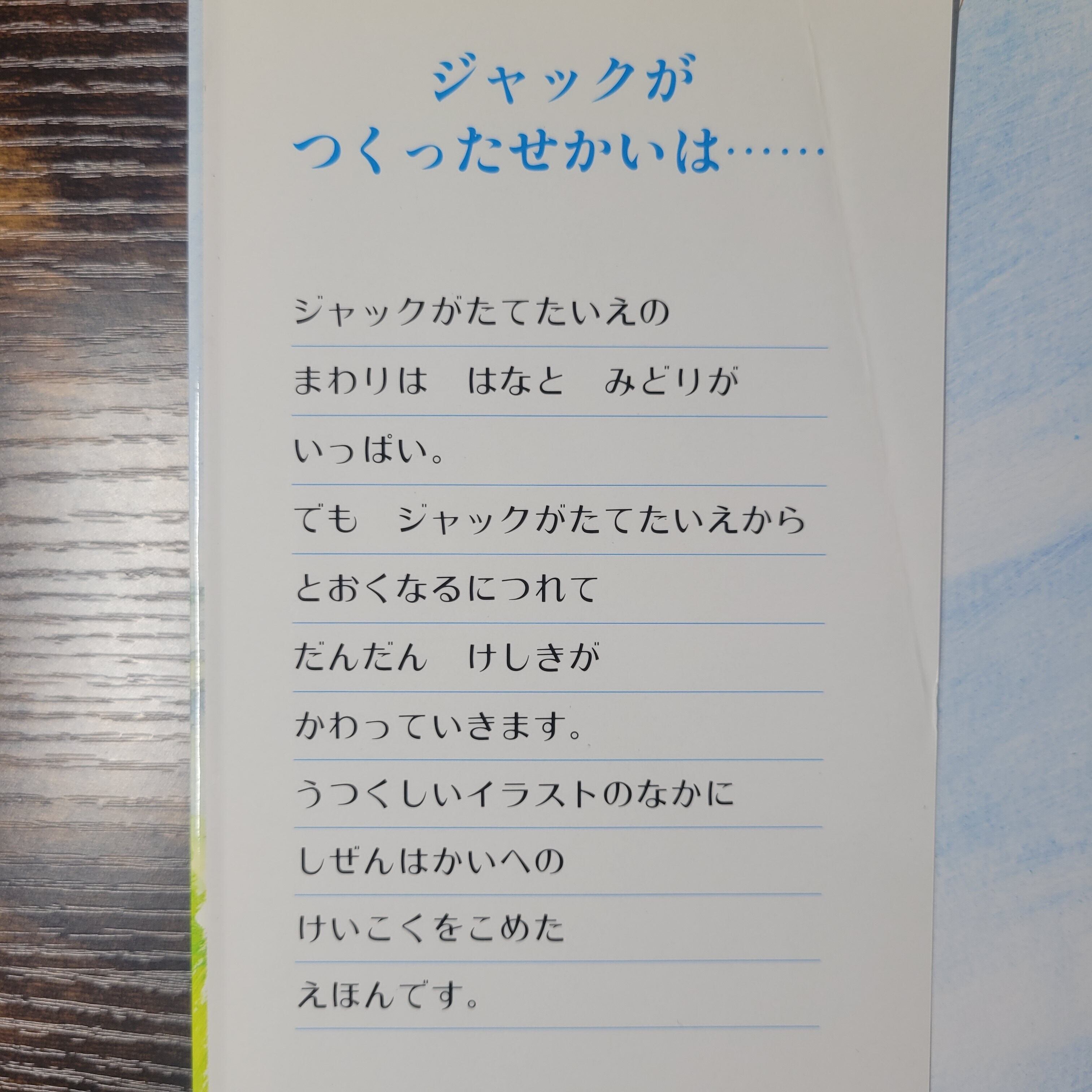 カバー袖より/ジャックがつくったせかいは・・・ジャックがたてたいえのまわりははなとみどりがいっぱい。でもジャックがたてたいえからとおくなるにつれてだんだんけしきがかわっていきます。うつくしいイラストのなかにしぜんはかいへのけいこくをこめたえほんです。