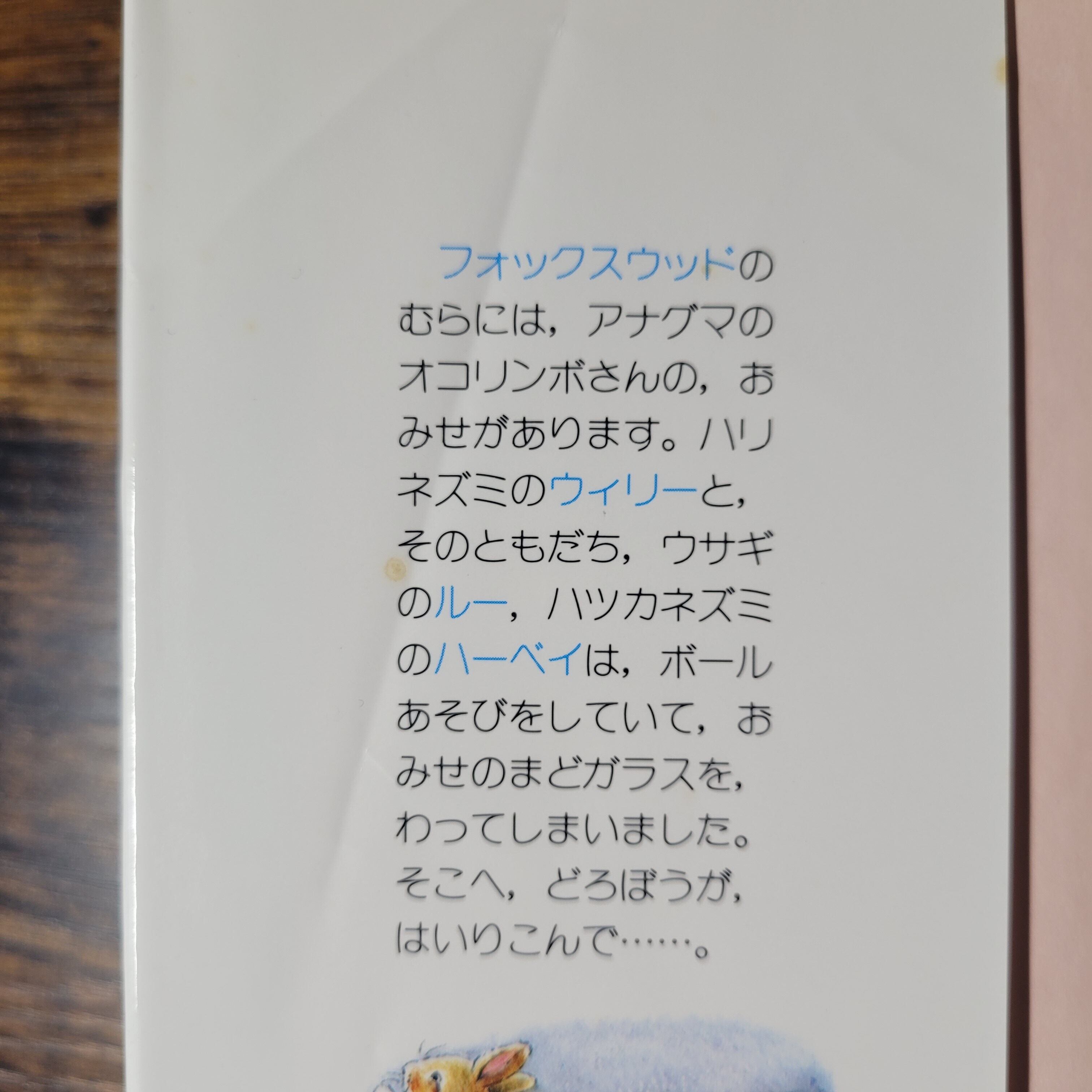 カバー袖より/『いっとうしょうはだあれ』フォックスウッドのむらの、ボートレースまで、あと2しゅうかんです。ハリネズミのウィリーと、そのともだち、ウサギのルー、ハツカネズミのハーベイも、てづくりのふね〈こうしゃくふじんごう〉にのって、レースにでることにしました。ところが、らんぼうなクマネズミたちが・・・。/『つきよのぼうけん』フォックスウッドのむらには、アナグマのオコリンボさんの、おみせがあります。ハリネズミのウィリーと、そのともだち、ウサギのルー、ハツカネズミのハーベイは、ボールあそびをしていて、おみせのまどガラスを、わってしまいました。そこへ、どろぼうが、はいりこんで・・・。/『びっくりクリスマス』フォックスウッドのむらも、もうすぐクリスマスです。ウサギのルーとハツカネズミのハーベイは、キャロルをうたって、プレゼントのおかねを、かせごうとしますが、だれも、みみをかしません。あるひ、たきぎをとりにきた3にんは、「たすけてー」という、ひめいをききますが・・・。/『ひみつがいっぱい』フォックスウッドのむらにすむ、ウサギのルーに、はつめいかのおじさんから、おてがみがきました。すごいはっけんがあると、いうのです。ルーと、そのともだち、ハリネズミのウィリー、ハツカネズミのハーベイは、おじさんの、ふうしゃごやへ、でかけました。ところが、じけんが、おこり・・・。